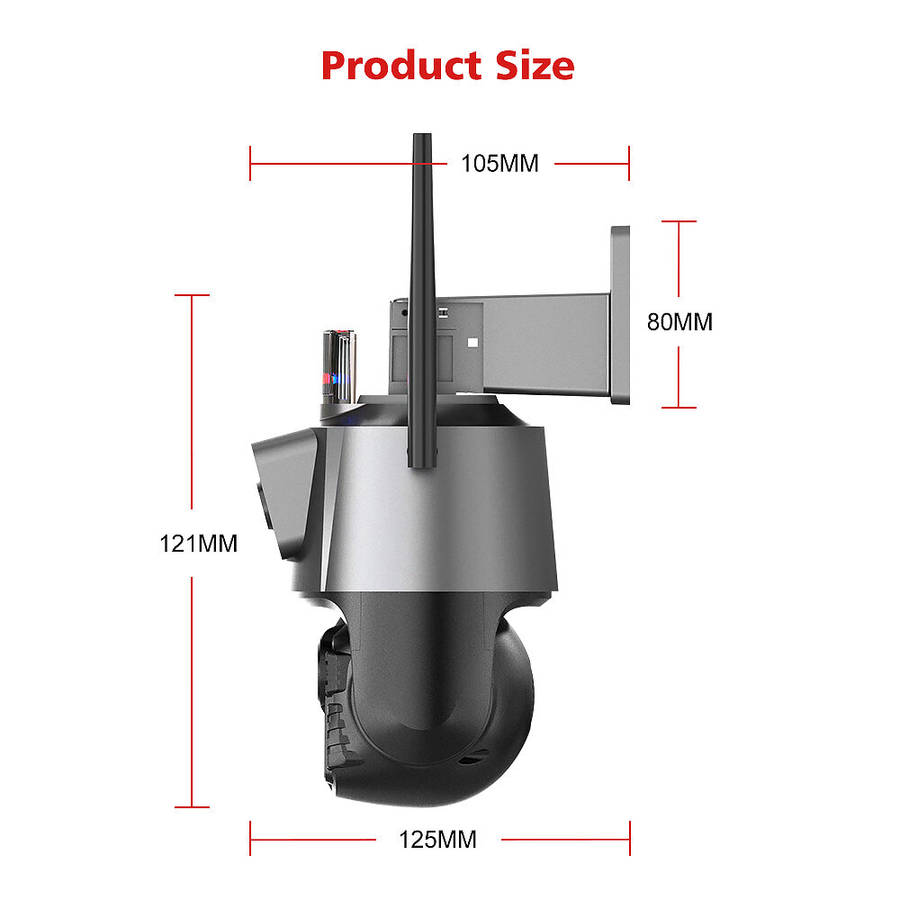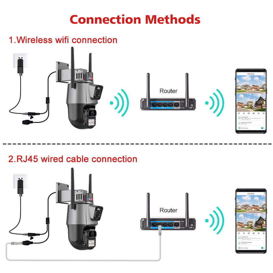 Dual-Lens Dual-Screens Realtime Synchronous Monitoring3.6MM Lens Fixed-Point Camera : Panoramic Viewing6MM Lens PTZ Camera : See Far Distance And More DetailsPan Tilt Rotate Control in AppDue to the horizontal 355° and the vertical 90 °, you can remotely control the wifi outdoor camera to view every corner via your mobile phone.Dual-Screens Humanoid Detection & AlertTwo video screens show in APP , achieve dual-screens synchronous monitoring.When someone enter into the monitoring area, the camera will auto lock the targets quickly and push alerts via email or notifications to your phone in time.Dual-Screens Human Tracking Auto ZoomTwo video screen